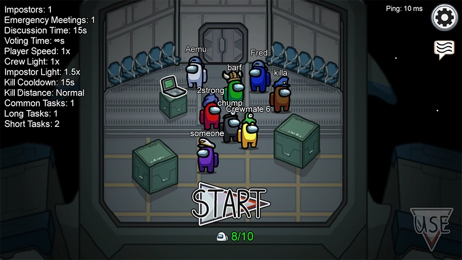 提供4到10名玩家共同游玩,以宇宙为舞台的狼人杀游戏。玩家将分为Crewmate(机组员)与Imposter(伪装者)这两个阵营,进行游戏直到达成所属阵营的胜利条件。