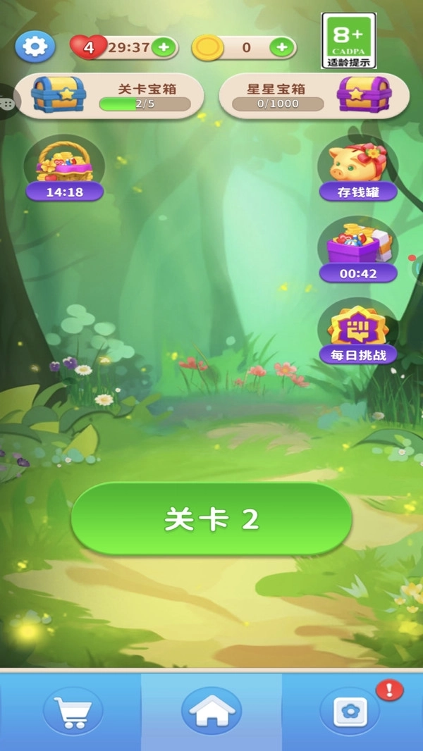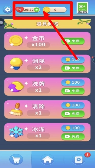 2.画面上方显示当前体力与金币数量,体力每隔一定时间自动恢复,金币可通过闯关或看广告获得使用。