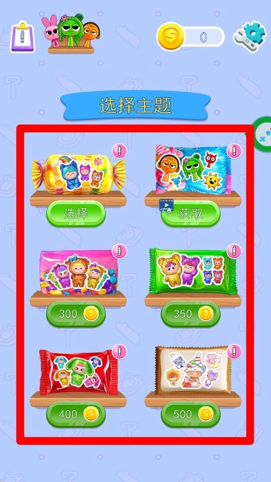 1.玩家可以选择不同的果冻主题包,通过点击“选择”按钮来开启每个主题包,主题包内包含不同的果冻角色。