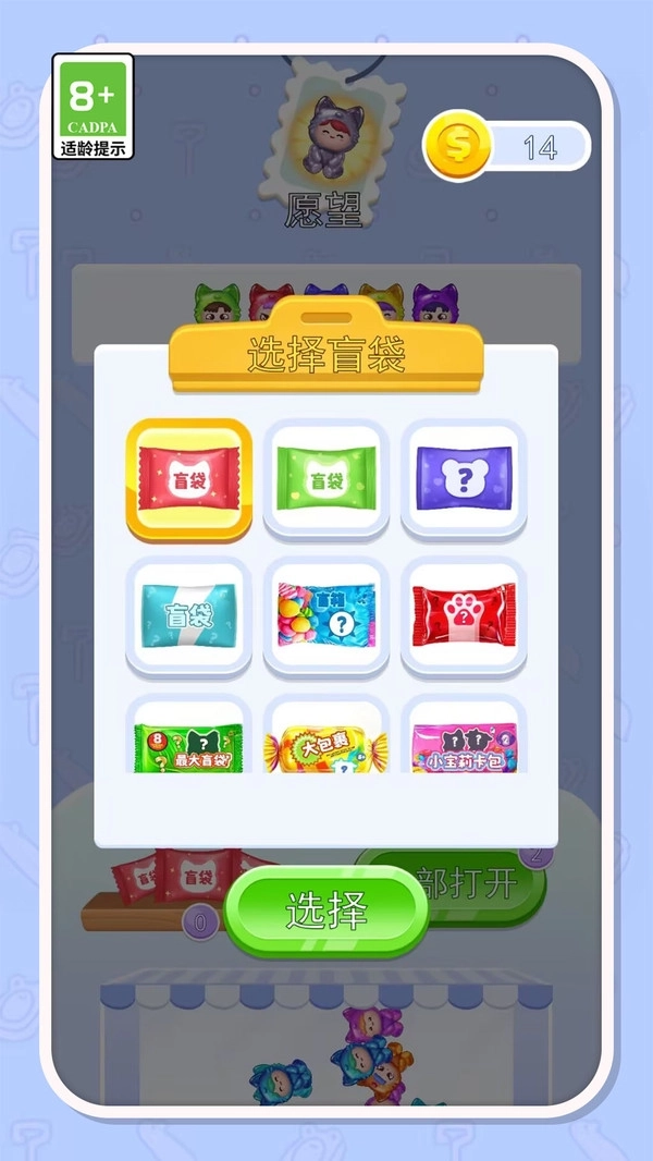 2.在选择盲袋时,玩家可以选择开启不同的袋子,每个盲袋都包含不一样的果冻角色,点击“选择”按钮来查看和开启。