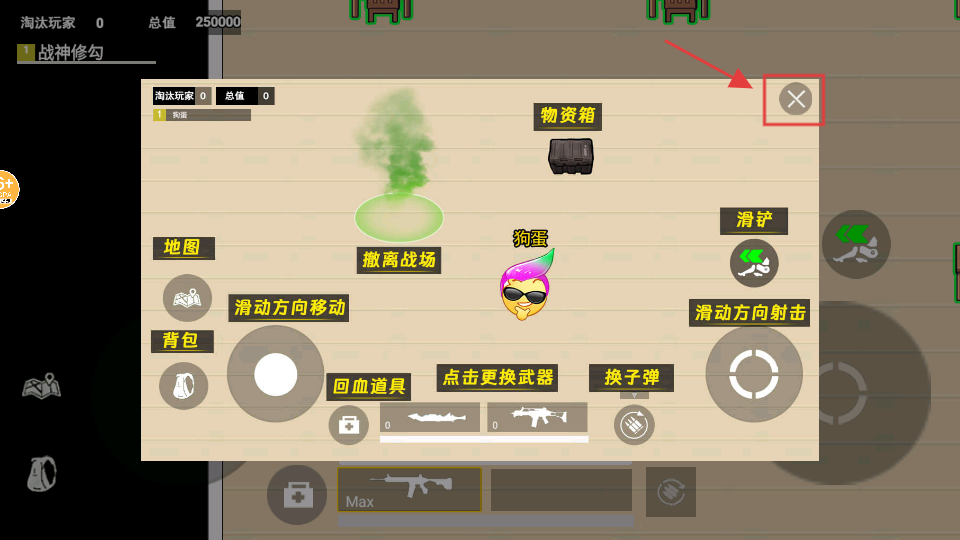 2、关闭界面提示,先熟悉【地图】和【背包】功能,通过【物资箱】获取装备,务必牢记【撤离战场】的时机,战斗时用滑动操作控制移动。