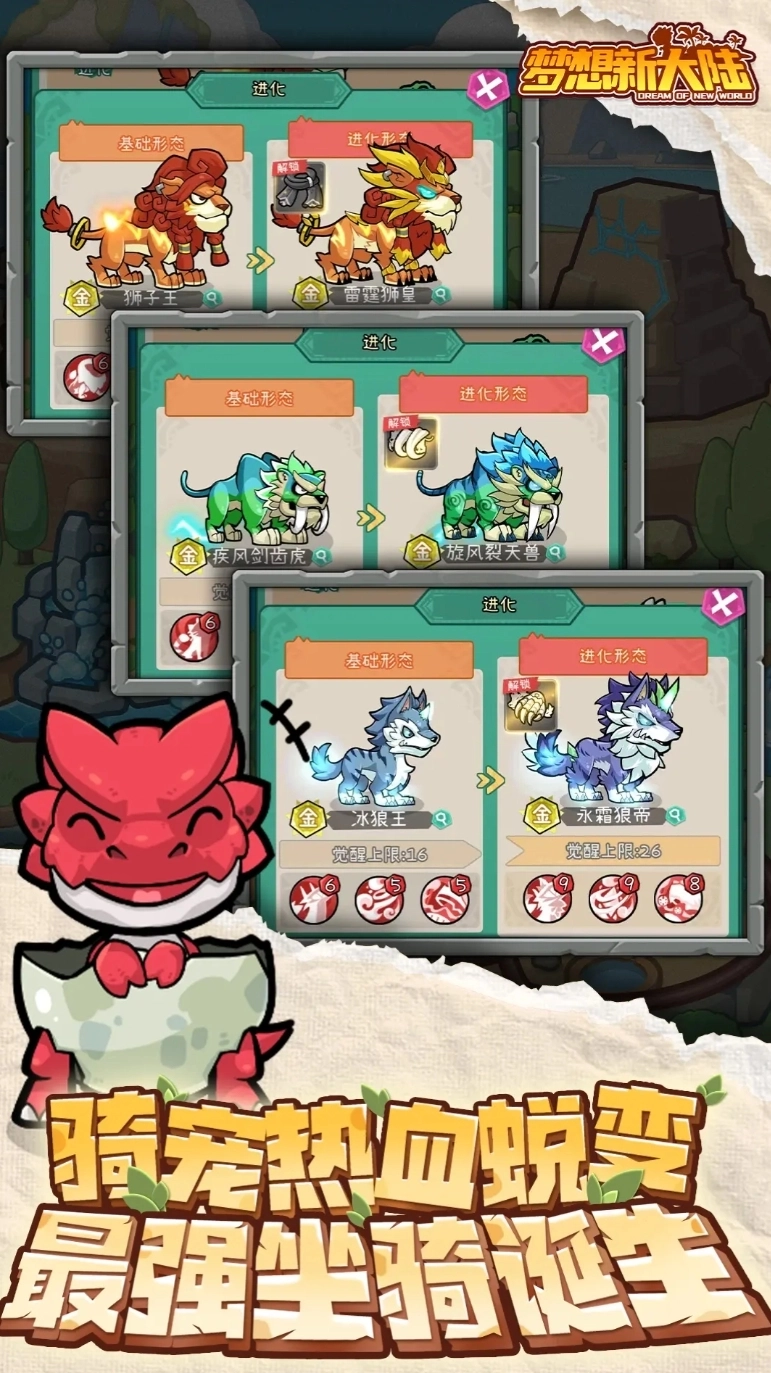 梦想新大陆是一款为忙碌现代人量身打造的轻松放置挂机,它将你带入一个充满奇幻色彩的石器时代,让你在探索未知大陆、驯服史前恐龙、体验刺激冒险的同时,享受轻松挂机带来的游戏乐趣。游戏不仅提供丰富的抽卡抓宠玩法,让你在闲暇时刻收获惊喜,更通过自动积累资源和提升战力的挂机系统,让你告别繁琐操作,随时随地畅享游戏带来的轻松与快乐。