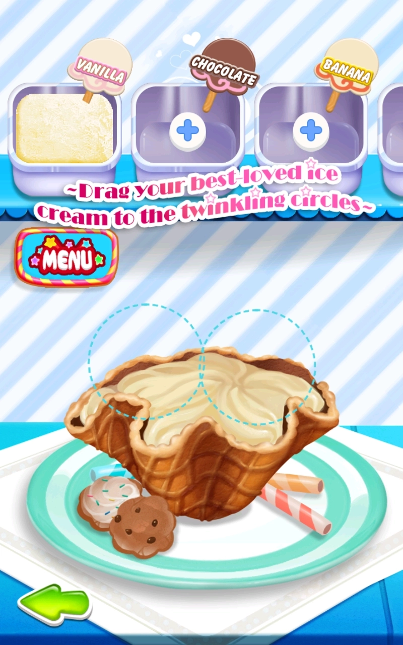 5、等冰淇淋冻好了,选择一个玩家喜欢的造型,然后将冰淇淋球拖到闪动的圆圈里,玩家可以组合不同的口味,让它更独特。