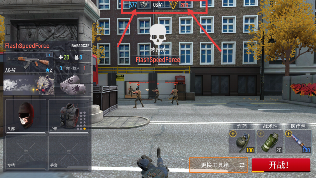 战斗结束后查看战绩,可更换【工具箱】,调整【头部-护甲】等装备后,点击【开战!】继续战斗提升战绩。