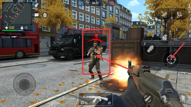3、遭遇敌人时,瞄准其身体部位并点击射击按钮进行开火,借助【AK-47】的火力压制效果,在城市街道场景中对敌人实施精准打击。