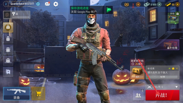1、进入游戏后,先查看【任务-爆头击杀20个敌人】,在熟悉【装备】界面的内容后,点击【开战!】按钮进入战斗环节。