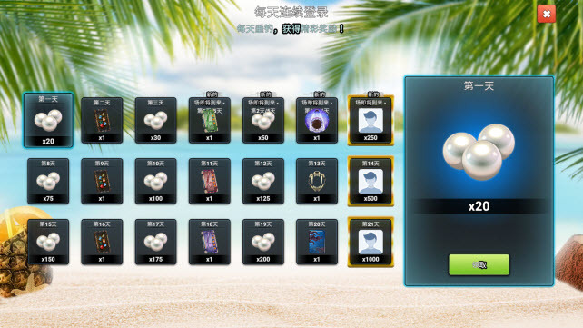 2、每天登录都能免费领取珍珠、装饰等各类奖励,而且累计登录的天数越多,能拿到的奖励就越丰厚。