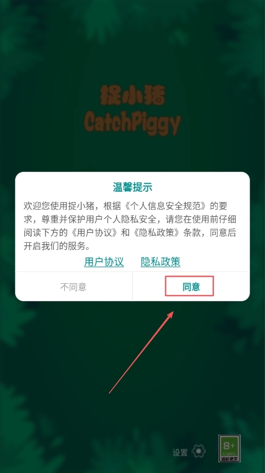 1、打开捉小猪游戏后,首先会弹出游戏协议窗口,认真阅读协议内容后,用手指点击同意选项,完成协议确认才能继续。