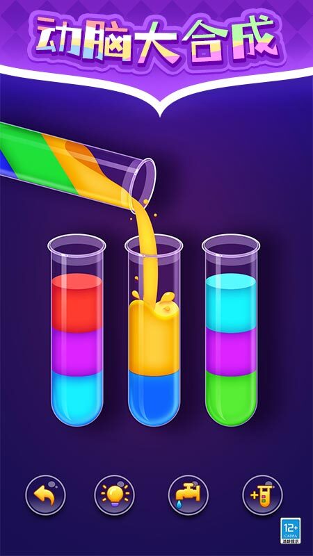 1、把水的流动作为核心,把物理特性融入玩法当中,要根据水流的特点来规划倒水的顺序,让益智的过程更有真实感和趣味性。