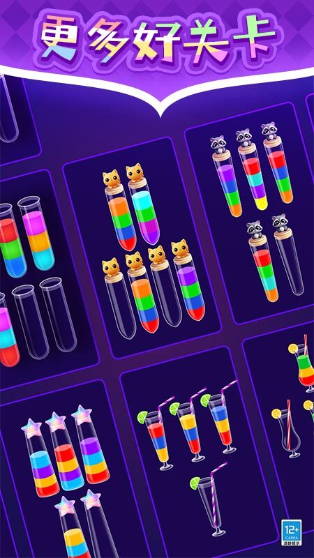 1、面对装有不同颜色液体的容器,需要通过倾倒液体的操作,把相同颜色的液体汇集到同一个容器里,顺利达成目标就能解锁下一关。