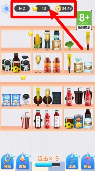 2.目标关卡挑战:每一关都有不同目标,例如收集指定商品或完成特殊排列,完成后可获得奖励并解锁下一区域。