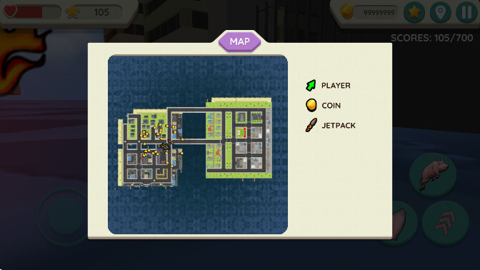 - 给小猪升级吧!你可以提升它的生命值、移动速度、奖励获取点数,还有喷气背包的续航时长。