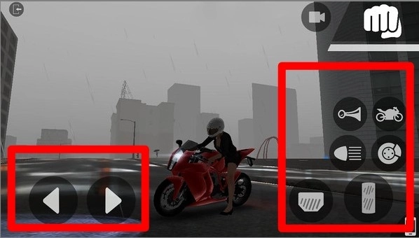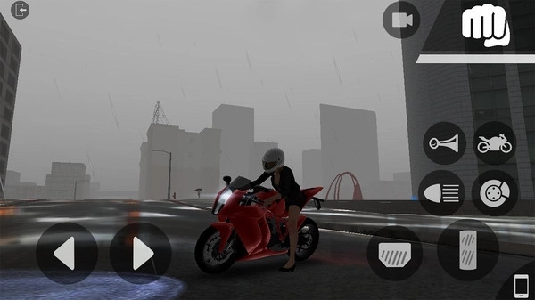 2.驾驶界面左侧为转向箭头,右侧为喇叭、载具切换、灯光与刹车等功能按钮,灵活组合操作可在雨天路滑稳控车身。