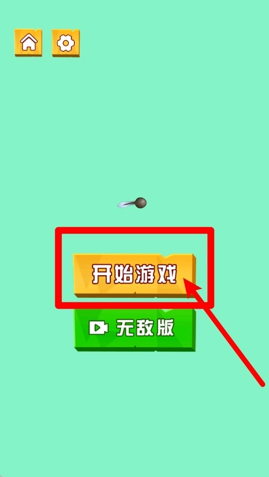 1.主菜单界面:点击开始游戏进入关卡,亦可选择无敌版体验,左上角房屋与齿轮用于返回主页与设置。