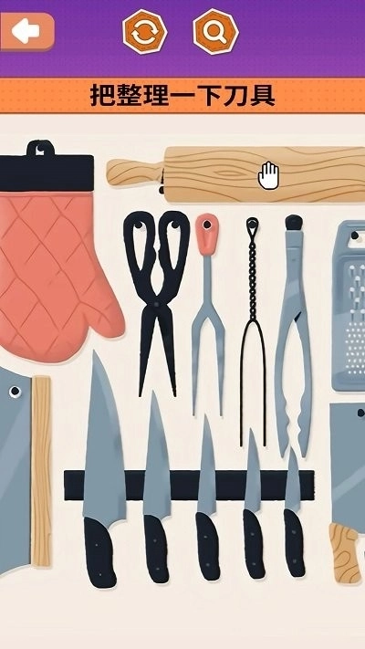 3、通过拖拽将散落的厨具放入指定区域,当所有物品摆放整齐时,会触发完成动画和评分界面。