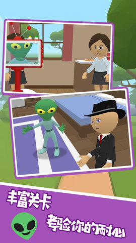 《猎杀伪装外星人》是一款轻松有趣的益智休闲小游戏,玩家的目标是揪出所有潜伏在人类社会里的外星人,以此逼迫外星首领妥协,最终让地球免遭外星入侵的威胁。这些外星人十分狡猾,它们伪装成人类的模样,悄悄融入人类的日常生活,暗中策划着邪恶的阴谋。不过值得庆幸的是,科学家们成功研制出了特殊的识别设备,能协助玩家找出并消灭这些伪装的外星人,守护地球的安全。