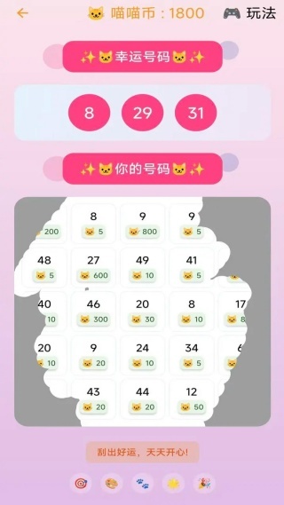 2、要是刮出的号码与幸运号码相同,就能得到数字号码下方对应的猫币奖励,接着继续刮奖。