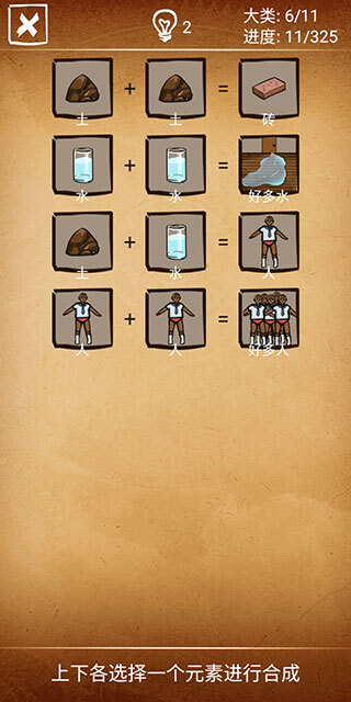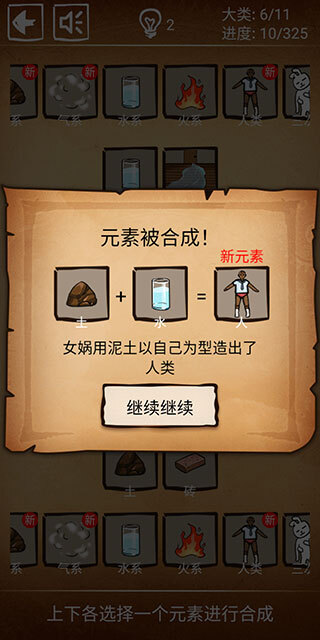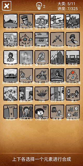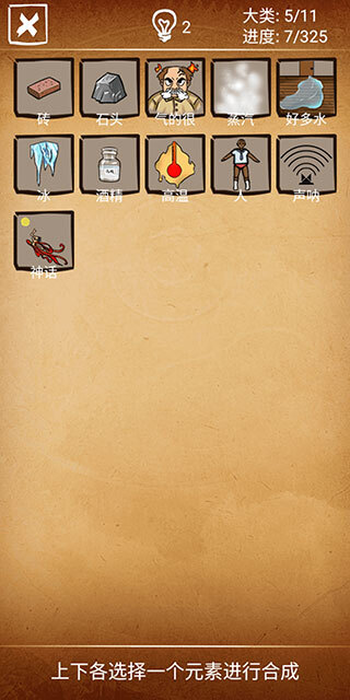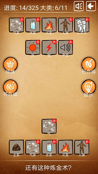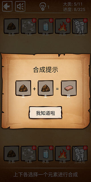 2、一开始仅提供5个初始元素,后续通过合成操作能够解锁更多新的元素。