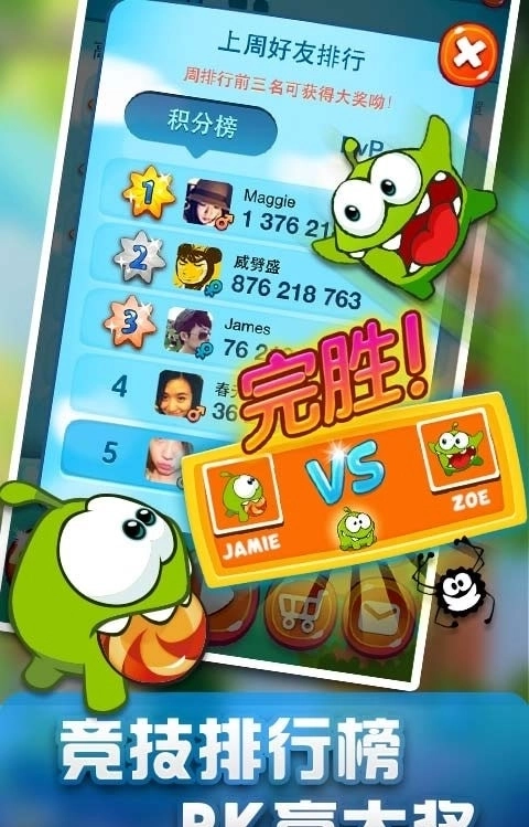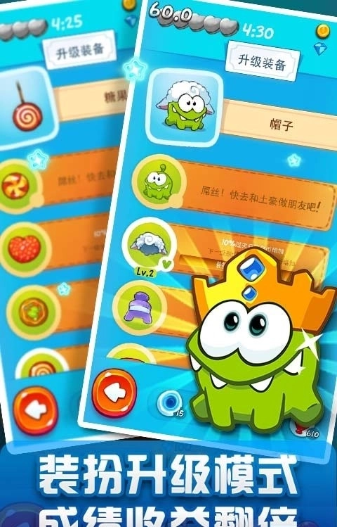 喂食角色完成目标,最终将糖果或南瓜安全送到小怪兽嘴里,满足它的食欲,成功完成关卡目标进入下一挑战。每个小怪兽都有独特的动画表现,增加了游戏的趣味性。