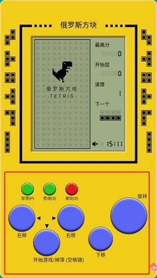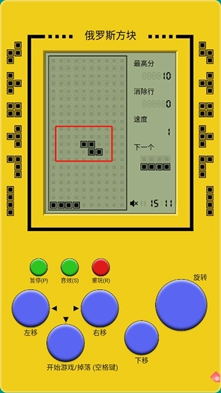 经典俄罗斯方块游戏主界面直接模拟的以前经典的游戏机,并玩家需要点击游戏机中按钮才能对方块对其进行左右移动,或是旋转下移,可很好的带大家回味经典,欢迎有兴趣的小伙伴们自行体验。