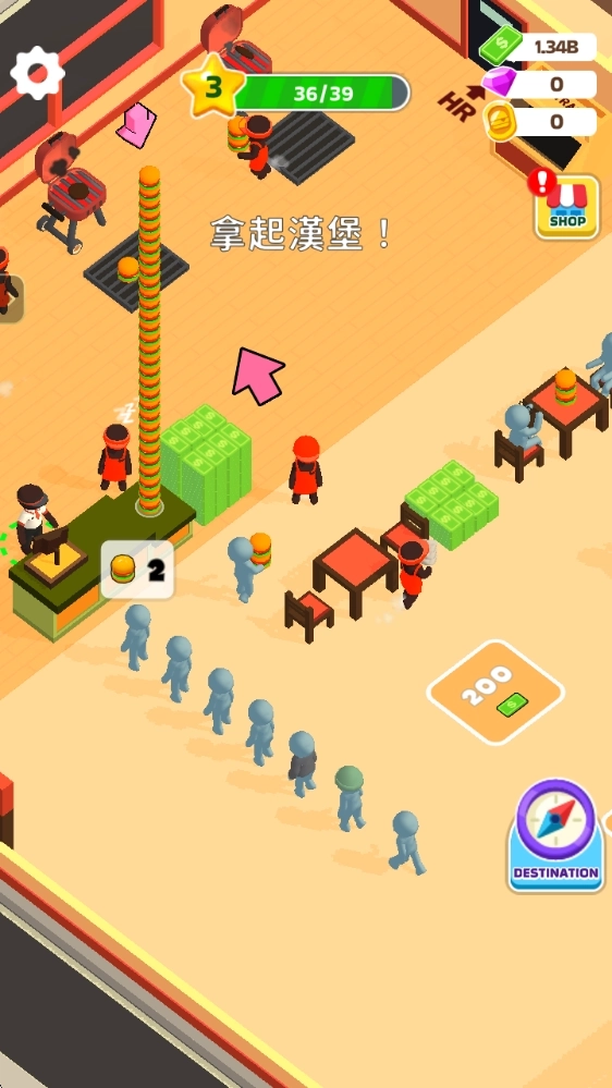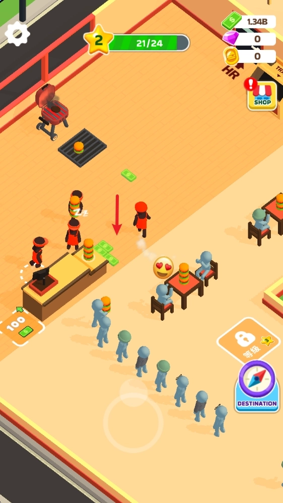 员工招募与管理:当业务量增大时,前往“人力资源中心”招募员工。你可以分配员工去制作汉堡或当收银员,并花费金币提升他们的等级,使他们跑得更快、拿得更多。