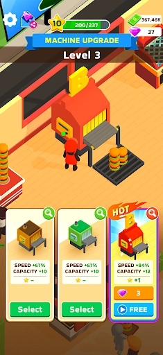 玩家可以通过赚取的金币升级角色的“移动速度”和“搬运量”,同时也能提升员工的工作效率,体验从“亲力亲为”到“甩手掌柜”的进化。