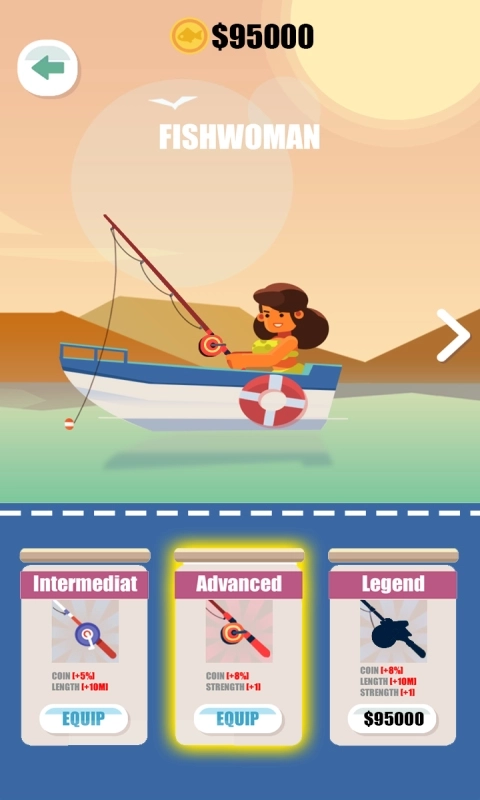 4、玩家可消耗金币升级渔具等级,以便钓上更稀有的鱼儿。