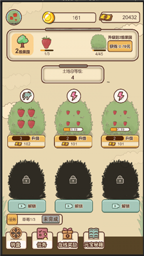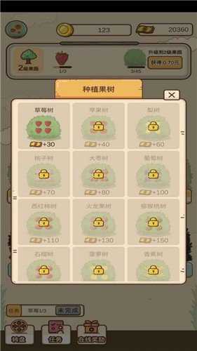 3、持续种植能够解锁更多果树种类。你栽种的果树数量越多,最终获得的收成也就越丰厚。