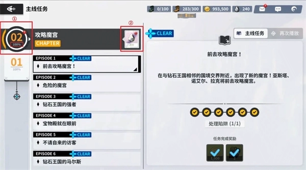 在完成任何章节的①「全部任务」后,需要点击②「章节通关奖励」,才能获得该章节的通关奖励。