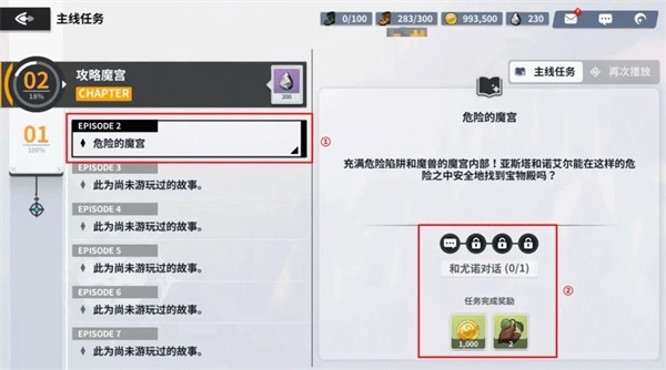 玩家可以在任务栏中查看①「主线任务」以及②「任务内容」和「完成任务时可获得的奖励」。