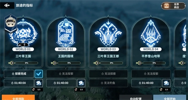 在每个世界探索完最初固定的探索地点后,从下一次重置时间开始,可以通过「旅途的指标」界面,在完成过一次寻找所有固定探索地点的世界中使用「自动探索」功能,这样就能非常有效地节省时间和精力。