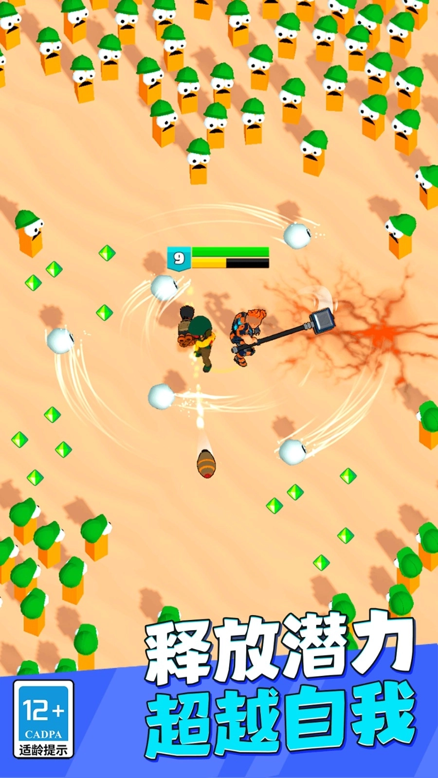 1、玩家需要在怪兽群中生存下来,收集宝石,升级武器,增加队友。