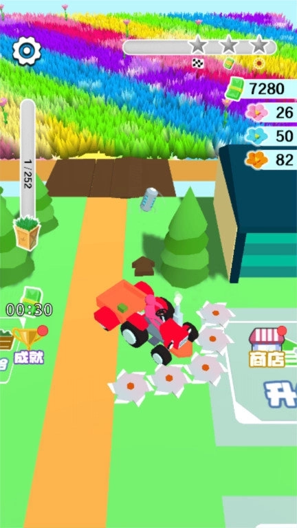 2、多彩视觉呈现,鲜艳色彩搭配和动态光影效果,打造绚丽多彩的割草场景。