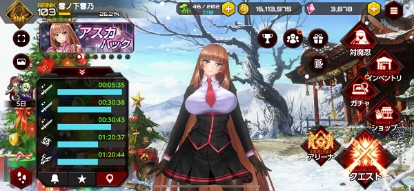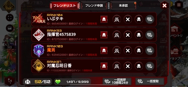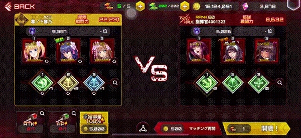 最上栏:人物标识,等级及指挥官名,嘴上一栏是体力(20AP/h),金币和对魔石(抽卡课体力)