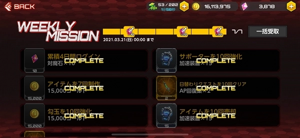 周常任务:每周都有就是累计登陆4天,可拿10石,其他的任务如日替战斗10次,战斗获得道具20个,卖道具10次,制作东西7个,勾玉/支援者/武器强化10回,主线战斗5次等,很简单。