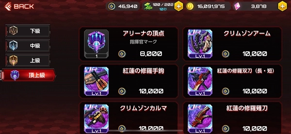 我只截取了上级的奖励,这个是有个总积分来排名,一般像我这种对竞技场没啥兴趣,但竞技场是获取石头的主要来源之一,在上级每周结算是75石+竞技币+材料礼盒,越高石头会越多。对于竞技场有三点需要说明:第一,每周结算是会重置回6000,但如果这周分不足7000,会-1000降级。第二,战斗始终会获得竞技币,但是如果输了会减分。第三,如果你5次内到达100名内/或者在100名内,就会直接PVP,不会是打人机了;如果不满足条件,则是会打五次人机再遇到PVP。↓下面说下竞技场商店↓