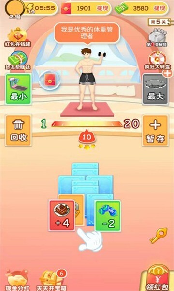 系统会发放增肥卡与减肥卡,玩家在关卡内使用完这些卡片后,需将角色的体重控制在增加1到20斤的范围内,这样就能获得红包奖励。