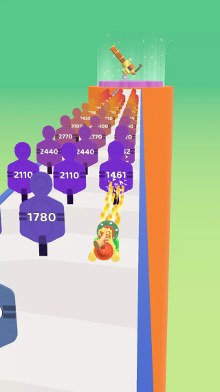 在前进的途中收集金币和武器升级道具,突破前方的障碍后就能解锁顶级武器。