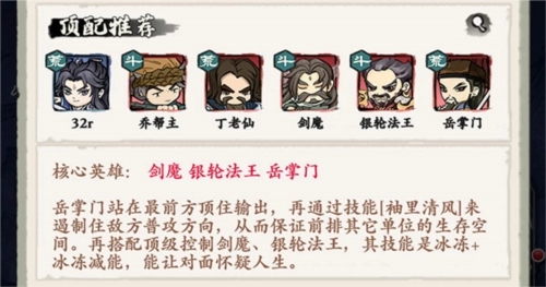 核心英雄:剑魔、银轮法王、岳掌门。岳掌门站在最前方顶住输出,再通过技能袖里清风来遏制住敌方普攻方向,从而保证前排其它单位的生存空间。再搭配顶级控制剑魔、银轮法王,其技能是冰冻+冰冻减能,能让对面怀疑人生。