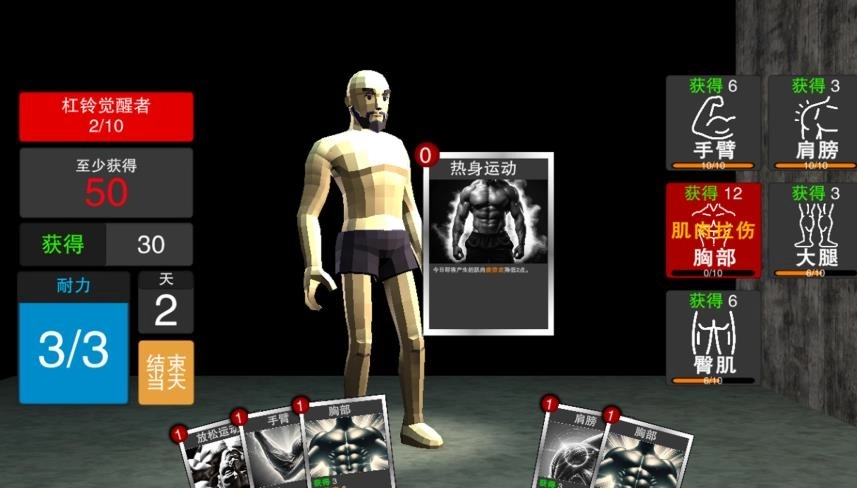 1、玩家需要通过合理搭配锻炼、休息和补充卡牌来塑造理想体格,每张卡牌都有独特功能。
