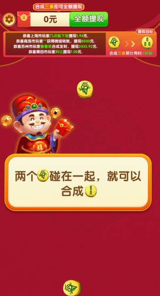 合合富贵的玩法是让玩家操控棋子,通过合成相同等级的棋子来提升等级,每次合成都能获得红包奖励,很有吸引力。游戏画面制作得相当精致,音效也十分悦耳,游玩体验很舒适。操作极为简单,几乎一上手就能掌握,不需要复杂的学习过程。此外,随着合成的棋子等级不断提高,解锁新等级还能获取额外红包,这让人很有成就感。