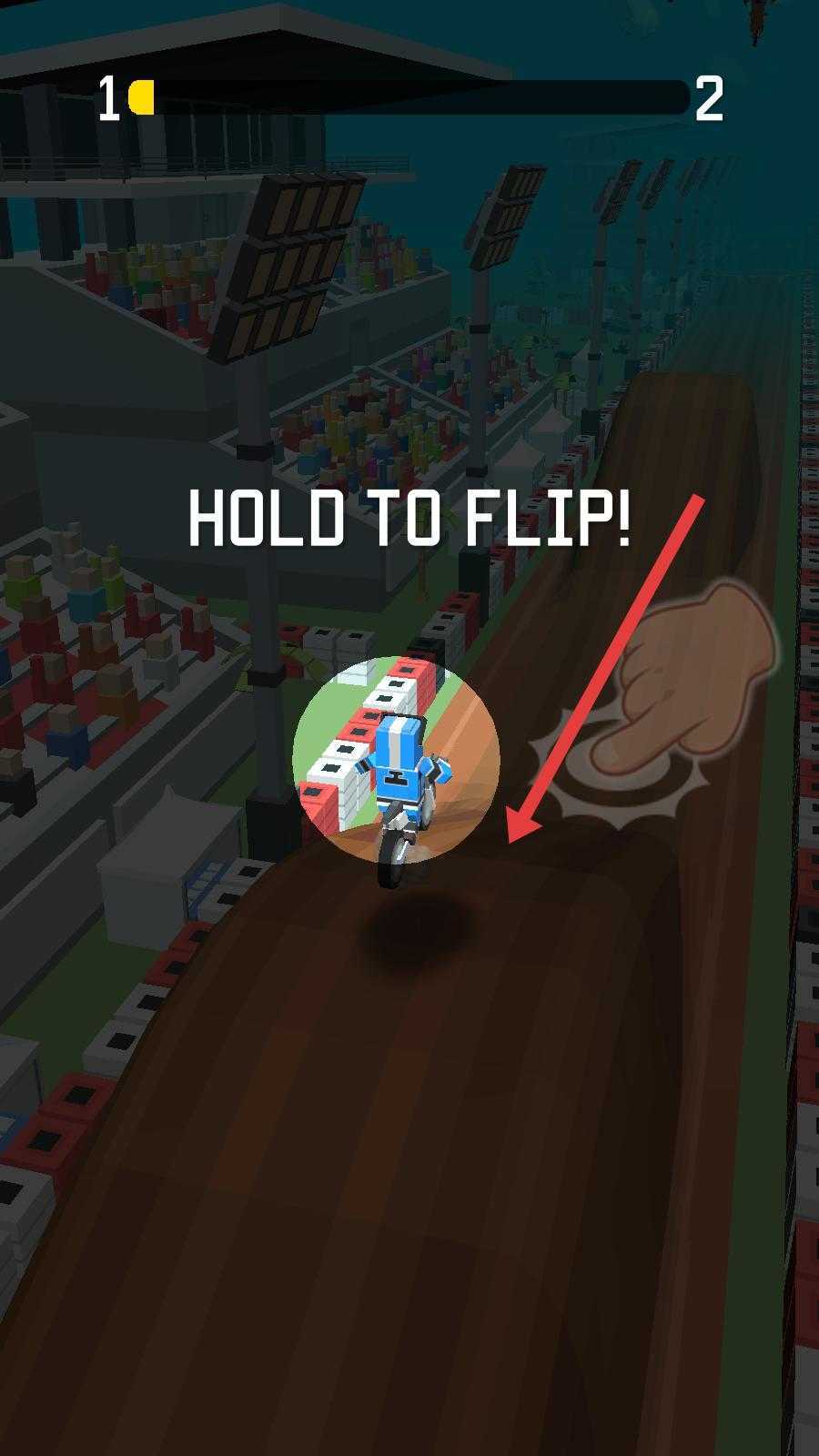 2、当赛道上出现坡道之类的地形时,按住屏幕就能让摩托翻转并完成特技动作,与此同时还要注意保持摩托的平衡和速度。