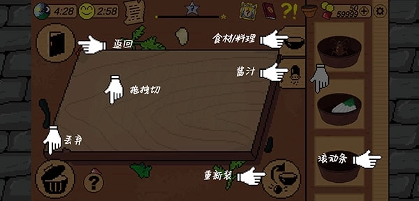 5、回到主页,点击菜板,把右侧的食材拖到左侧案板上,滑动屏幕就能切菜。此外,还有多种料汁可供选择用来腌制食材。完成操作后,点击图示右下角的“重新装”,将食材放入碗中。若有不需要的部分,可点击左下角的垃圾桶丢弃。