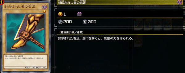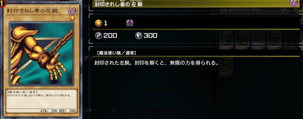 效果:当这张卡与「被封印者的右腕」「被封印者的左腕」「被封印者的右足」「被封印者的左足」在自己的手牌中全部集齐时,决斗将判定为自己胜利。