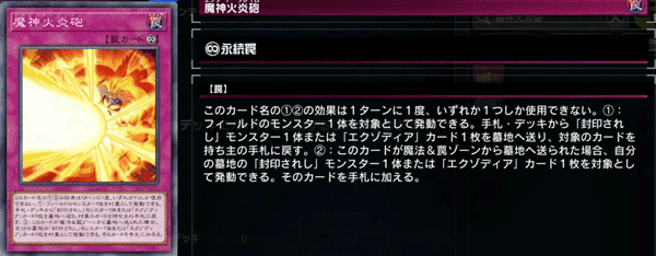 效果:「魔神火炎炮」的①②效果1回合内仅能选择其中1个使用1次。①:选择场上1只怪兽作为对象即可发动此效果。从手牌或卡组将1只「被封印」怪兽或1张「艾克佐迪亚」卡送入墓地,作为对象的卡片返回持有者手牌。②:当这张卡从魔法与陷阱区域被送入墓地时,选择自己墓地中1只「被封印」怪兽或1张「艾克佐迪亚」卡作为对象即可发动。将该卡片加入手牌。