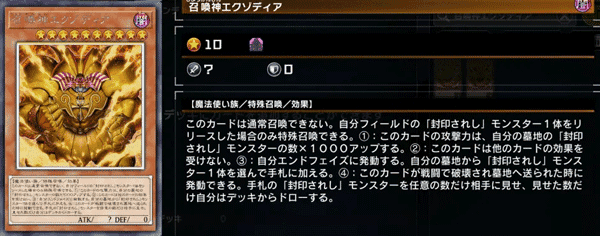 效果:此卡无法进行通常召唤,仅能通过「与艾克佐迪亚的契约」的效果特殊召唤。①:该卡不会因战斗或魔法·陷阱卡的效果而被破坏。②:在自己的准备阶段自动发动效果,此卡的攻击力提升500点。③:若自己墓地中缺少「被封印的艾克佐迪亚」「被封印者的右腕」「被封印者的左腕」「被封印者的右足」「被封印者的左足」中的任意一种卡,此卡将被破坏。