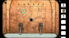 8、把方块放进墙上的凹槽里,点击墙壁会出现裂缝,之后点击有黑色影子的位置打破墙壁,用蜡烛去点燃两侧的火把,再点击油,按照上方“左右左左右右”的提示,逐个将火把点亮。