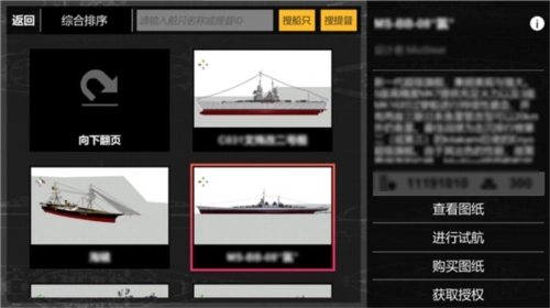 1、点击“购买设计图纸”按钮,可以进入游戏内的图纸交易大厅,在这里直接购买其他提督的优秀设计。同时您也可以查看其他提督的优秀图纸,并模仿其中结构加强您的设计