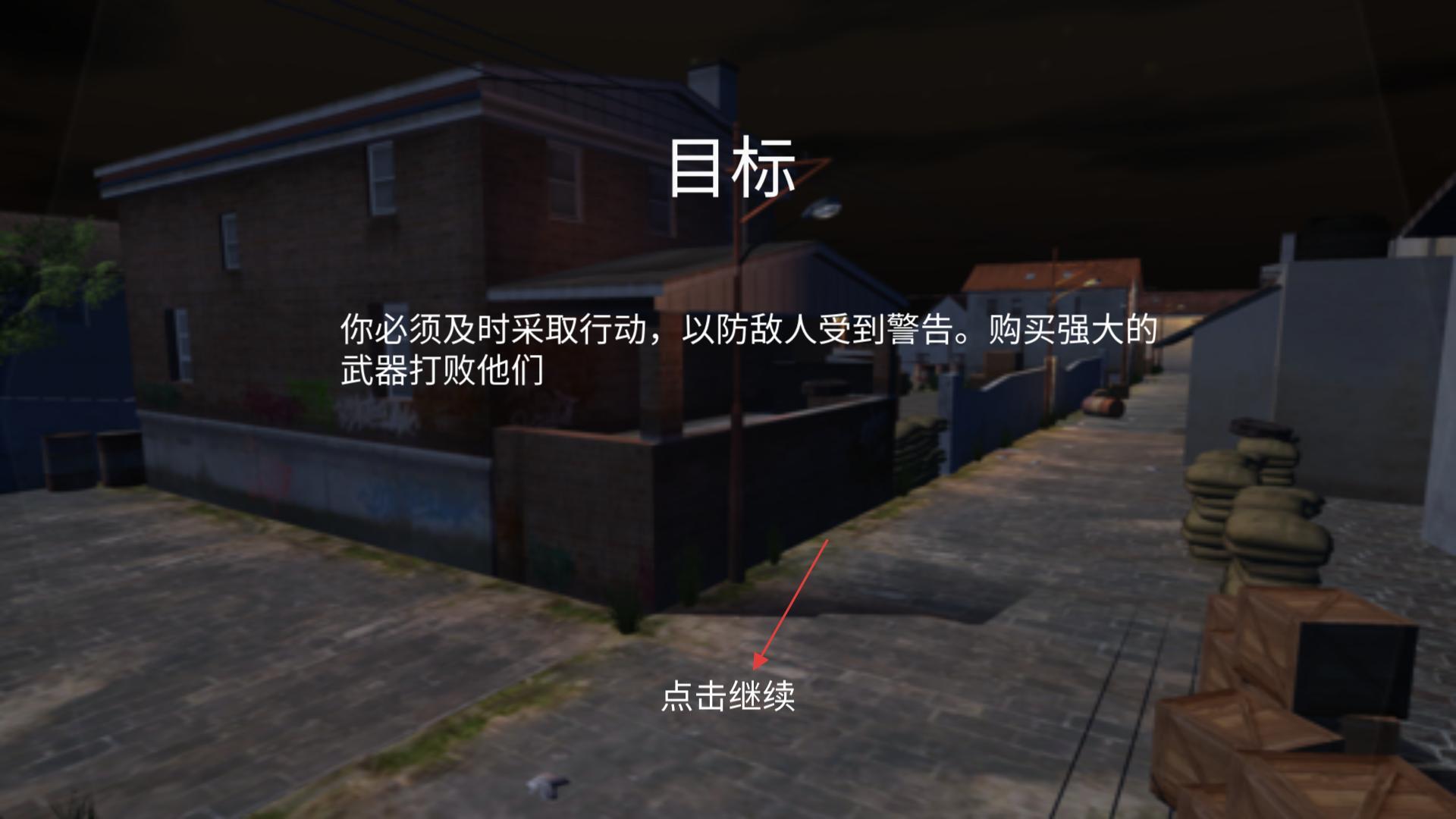 3、进入目标提示界面后,你会看到任务目标的相关说明,其中提示需及时采取行动以避免敌人发出警告,还可购买强力武器来击败敌人,点击“继续”即可进入游戏场景。