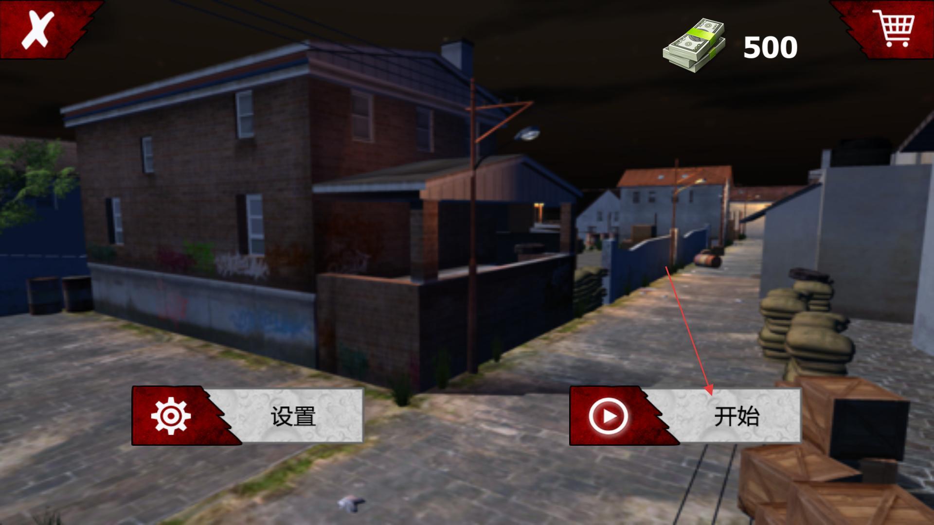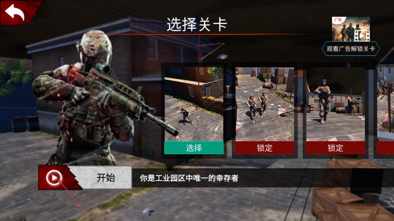 1、启动《战线精英枪战王者》,进入游戏主界面后,可看到设置、开始等功能按钮,界面上还显示着金钱数量,点击开始按钮即可进入关卡选择界面。